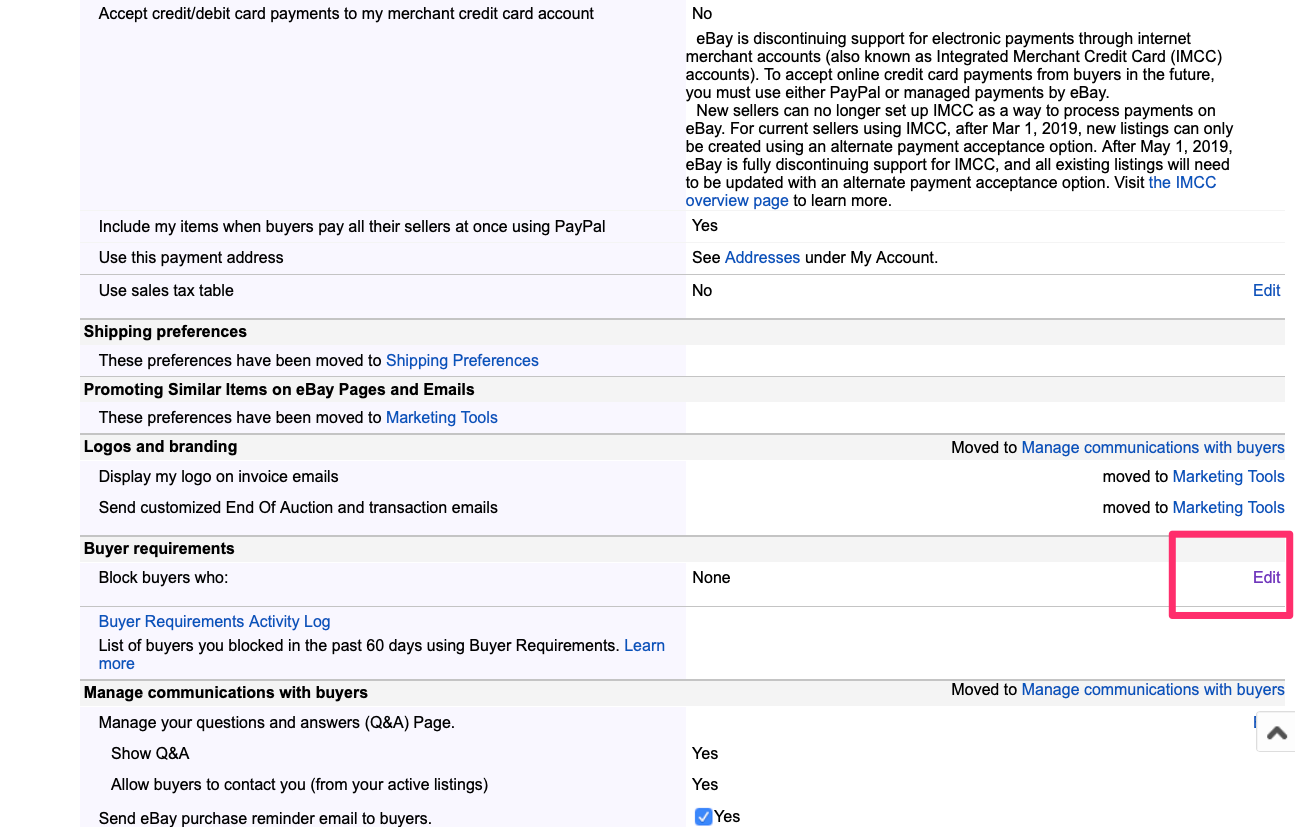 その後表示された画面を下にスクロールしていくと、画面の真ん中あたりに「Buyer requirements」という項目がありますので、その右側の赤線で囲っている「Edit」をクリックします。