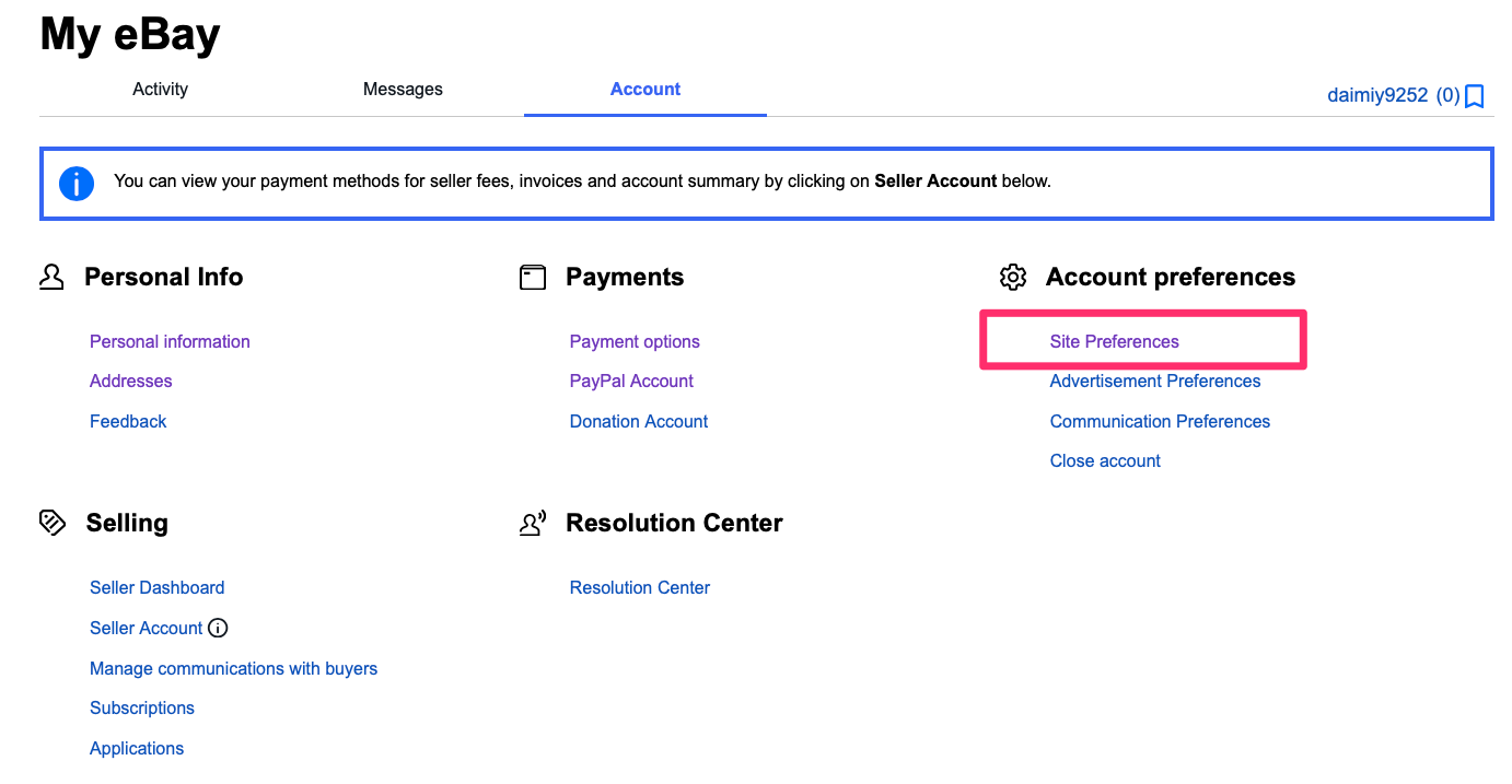 すると「My eBay」という画面が出てくるので、赤線で囲ってある「Site Preferences」をクリックします。