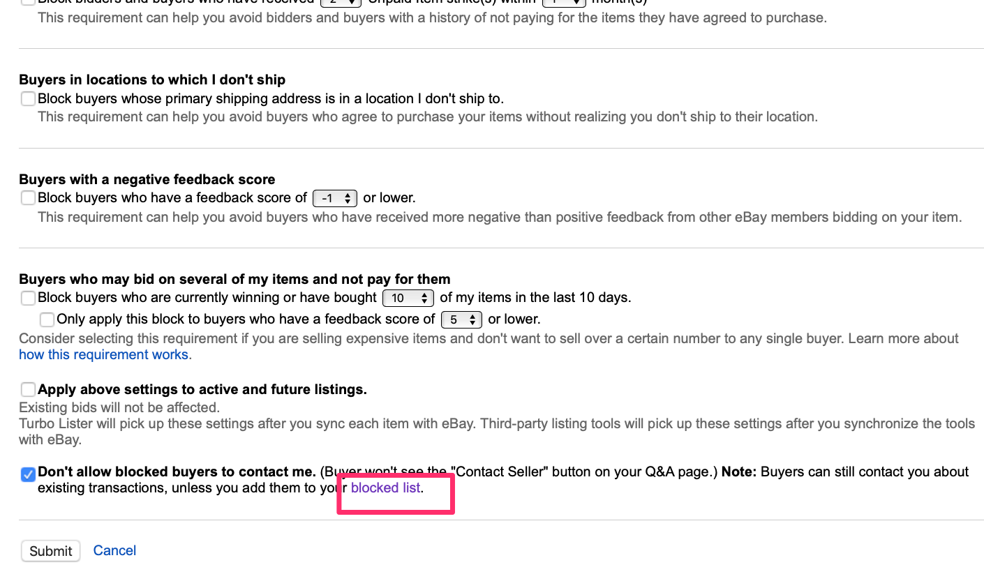 表示が切り替わった画面の一番下に「Don’t allow blocked buyers to contact me」という項目がありますので、そこにチェックが入っていることを確認し、同じく赤線で囲っている「blocked list」をクリックします。
