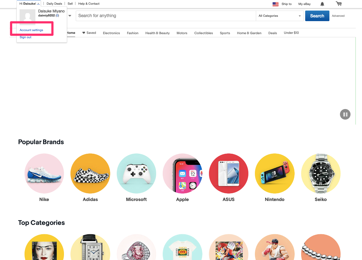 実際にebayの画面を開き、左上の「Hi ○○」とあるタブの中の「Account settings」をクリックします。(赤線部分)