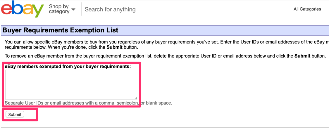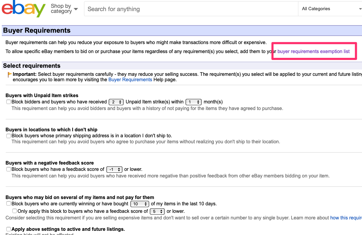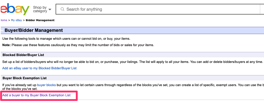 そして切り替わった画面の一番下に「Add a buyer to my Buyer Block Exemption List」という項目がありますのでここをクリックします。