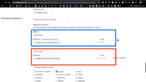 こちらも青枠がeパケット・eパケットライトの送料設定・赤枠がEMSの送料設定です。