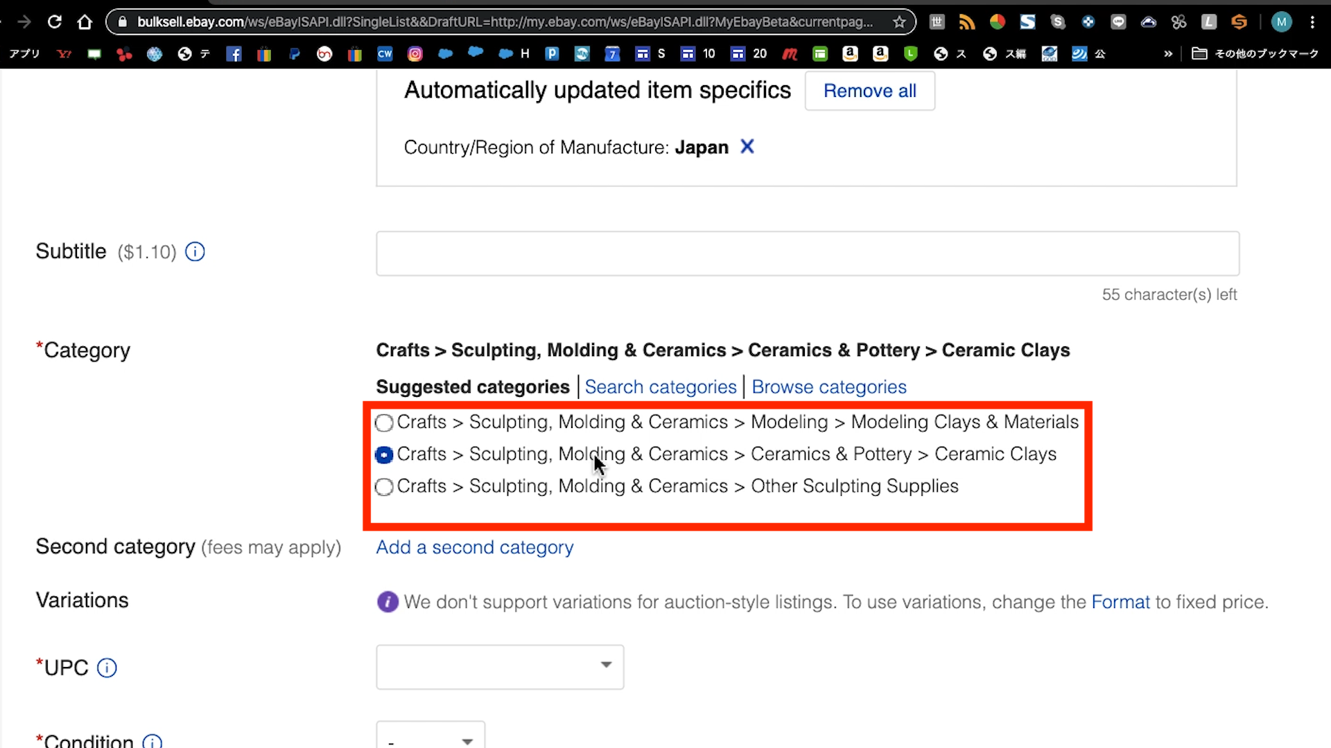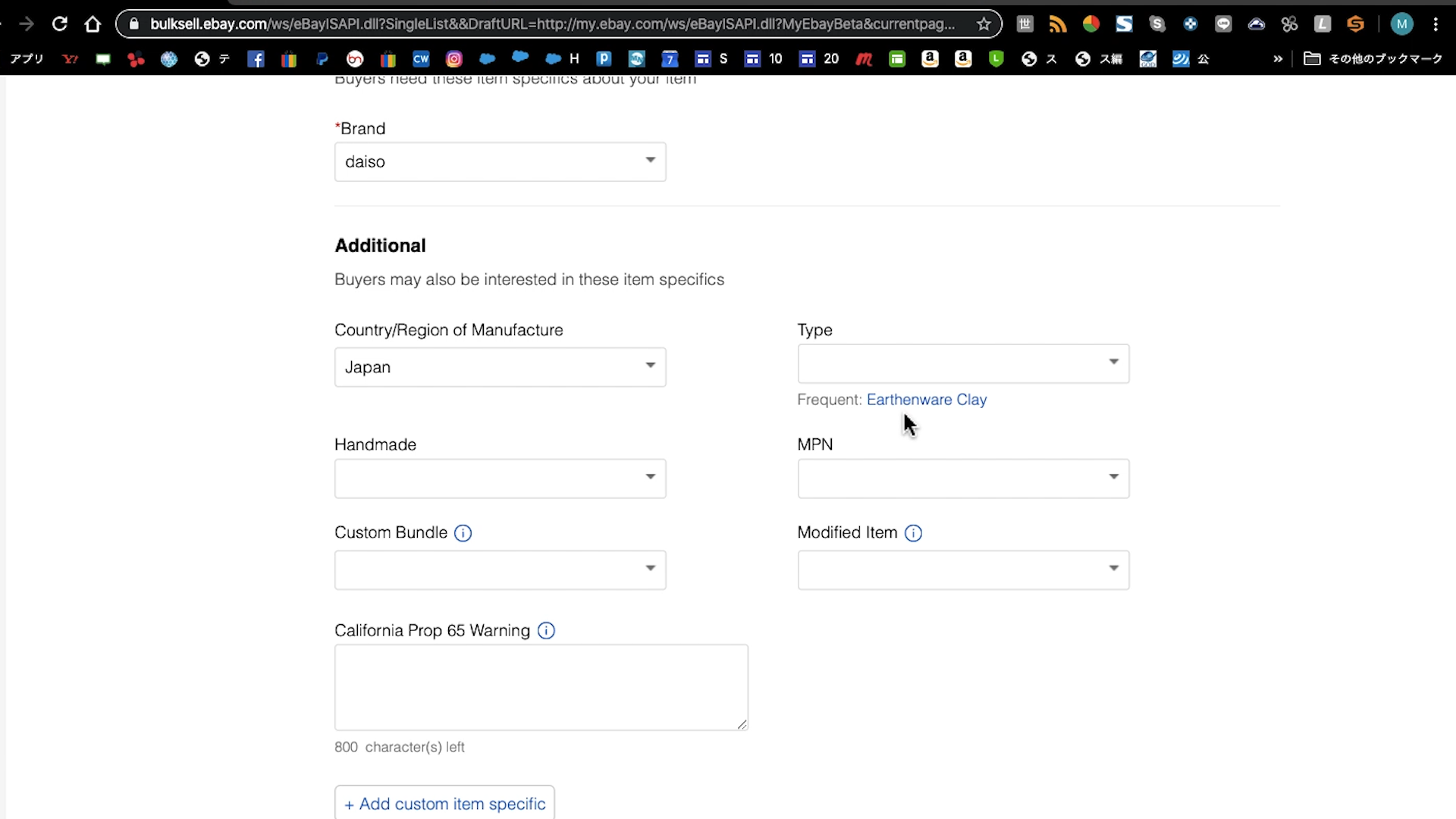 今回の出品するふわっと軽いねんどは、人気もあり売れやすい商品なのでCountry/Region of Manufactureの項目だけ入力をしました。