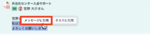文章を選択して、メッセージに引用をクリックします。すると、自分がこれからチャットする文章の中に誰かの発言が引用されて表示されます。